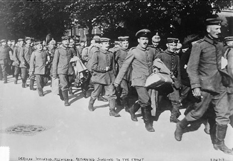 Fotografía de soldados alemanes marchando al frente en 1914. Library of Congress: https://www.loc.gov/resource/ggbain.18127/