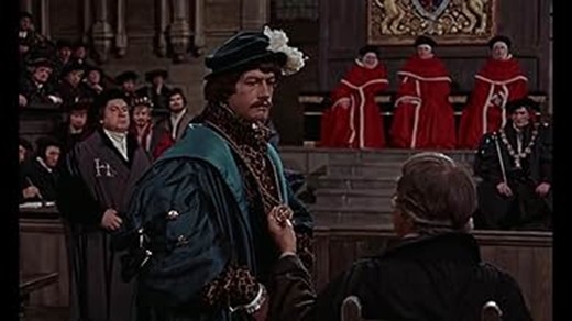 Las cosas cambiaron con el ascenso de Enrique VIII, ya que, un año después de la coronación, Moro fue nombrado subcomisario de Londres, un trabajo que consistía en asesorar a los sheriffs y actuar como juez en el Guildhall. A partir de entonces, según nos cuenta su yerno, formó parte de prácticamente todos los tribunales y consejos de cuestiones de importancia. También ejercía de embajador del rey, entrando formalmente a su servicio en 1517 como diplomático, entre otras funciones. Su ascenso en el ámbito público culminó en 1529 con el nombramiento de canciller tras la caída de Thomas Wolsey, un puesto que decidió dejar a penas dos años y medio más tarde, en 1532. Un hombre para la eternidad comienza precisamente justo antes de que Moro sucediese a Wolsey, cuando este último, interpretado por Orson Welles, se encuentra buscando posibles últimas medidas extremas para asegurar un heredero a la casa Tudor y requiere la presencia de Tomás Moro (Paul Scofield).