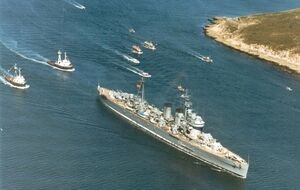 Tras asegurarse el dominio completo del mar formó parte en la revista naval que se realizó en aguas de Salou, localidad de la provincia de Tarragona. El 1 de abril de 1939, habiendo finalizado la guerra, entró en Cartagena, para poco después quedar anclado en El Ferrol (García Flores, 2000). Pasó a ser el buque insignia de la Armada, participando en gran cantidad de actos protocolarios, enseña de pabellón y semanas navales entre otros (García Flores, 2000). Ya en tiempos de paz obtuvo su bandera de combate el 5 de mayo de 1940 en Santa Cruz de Tenerife por suscripción popular. El 18 de febrero de 1941 zarpó a Santander para socorrer a la población tras un catastrófico incendio, prestando servicios médicos sirviendo como centro de comunicaciones y de suministro de energía eléctrica (García Flores, 2000).