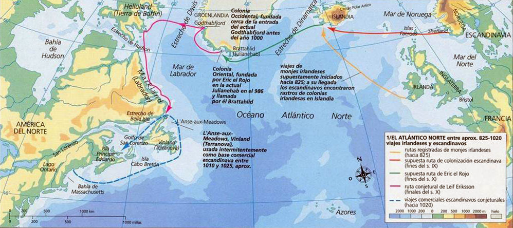 Mapa de los viajes vikingos hacia el Norte, tanto Islandia, como Groenlandia y Vinland.