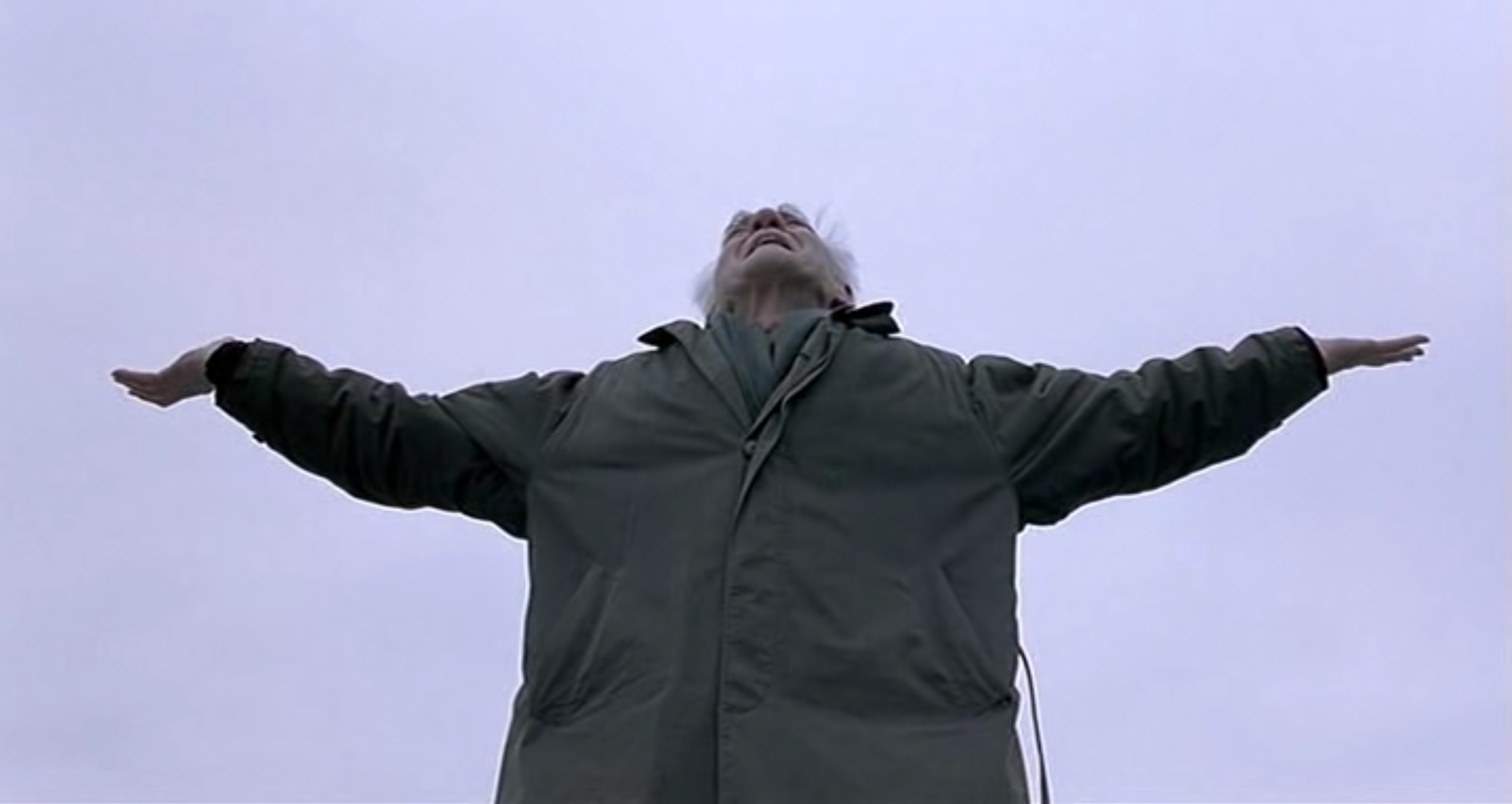 La imagen de la mano se cierra con un tercer opsigno, en este caso las manos de Spyros y la nieta Eleni, que se juntan tras la muerte de la abuela en una especie de retorno, el eterno retorno de lo mismo, cuando Spyros encuentra de nuevo a Eleni, esta vez joven, la nieta, y seguidamente caminan hacia la nieve que cae sobre Berlín y corren. Es la imagen que cierra el film, como una especie de conjunción de lo viejo y lo nuevo encarnados en ambos, el abuelo y la nieta con la esperanza de un nuevo renacer. ¿Para el mundo? ¿Para la utopía? ¿Para un siglo que se vislumbra aún más oscuro si cabe? Es la imagen final de la obra de un genio del cine, porque sin saberlo, esa imagen se convertirá en la última que conscientemente elaborara Anguelópulos.